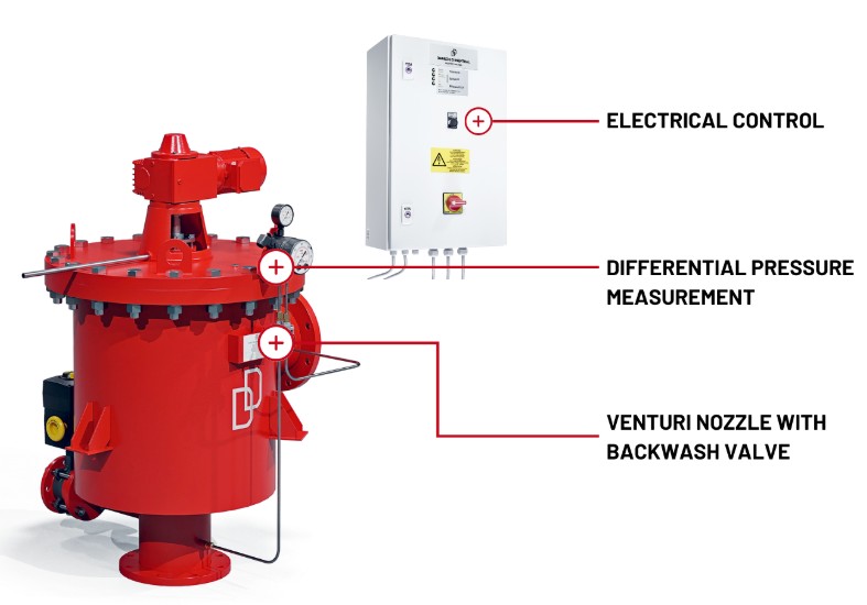 Cảm biến đo chênh lệch áp suất giữa cửa vào nước thô và cửa ra nước sạch sẽ phát hiện mức độ nhiễm bẩn của bộ lọc. Quá trình rửa ngược sẽ tự động bắt đầu khi đạt đến giá trị chênh áp đã cài đặt hoặc theo chế độ hẹn giờ.