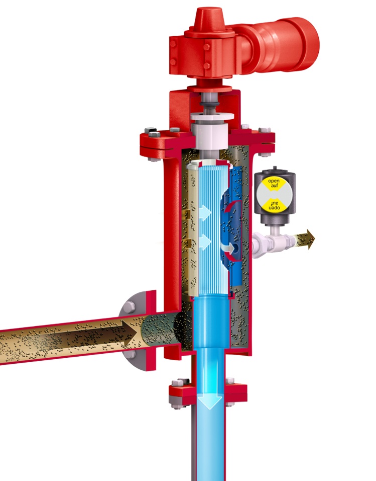 Cảm biến chênh áp sẽ phát hiện mức độ bám bẩn của phần tử lọc và kích hoạt rửa ngược khi đạt đến giá trị cài đặt. Van rửa ngược điều khiển bằng động cơ sẽ mở ra, tạo áp suất khí quyển. Áp lực nước sạch sẽ đẩy ngược các chất rắn bám trên lưới lọc theo chiều ngược với dòng lọc. Trong quá trình này, bộ phận lọc quay liên tục giúp làm sạch hoàn toàn bề mặt lọc. Sau 15–20 giây, van rửa ngược tự động đóng lại. Toàn bộ quá trình rửa ngược diễn ra song song với quá trình lọc, không làm gián đoạn vận hành.