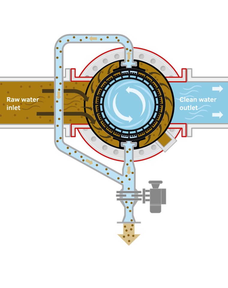 Van rửa ngược điều khiển bằng động cơ mở ra, tạo áp suất khí quyển trong đường ống rửa ngược và các kênh rửa trong vỏ lọc. Nhờ áp suất dư từ phía nước sạch, các chất rắn tích tụ trên phần tử lọc được rửa ngược ra ngoài theo chiều ngược với quá trình lọc.