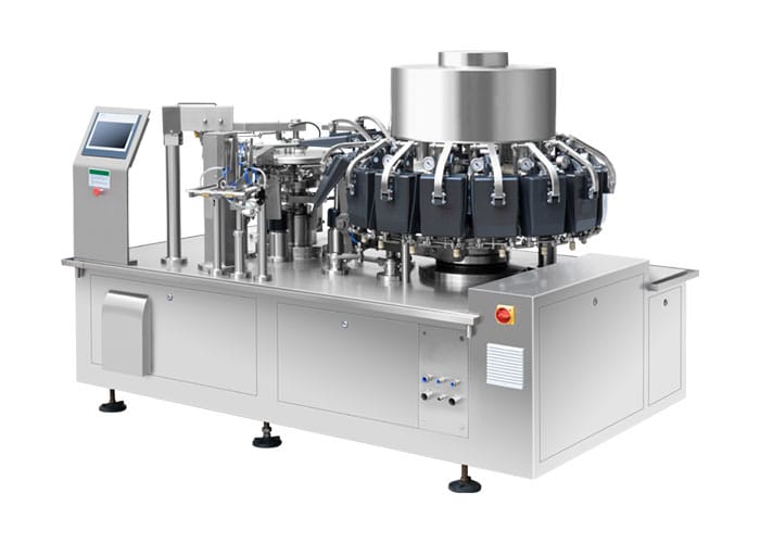 Máy đóng gói trạm xoay (Rotary packing machine) là một hệ thống tự động phức tạp, thực hiện các công đoạn chiết rót – hàn kín – xuất túi theo chuyển động quay tròn liên tục. Không giống các dòng máy đóng gói inline hoặc máy đóng gói dạng nằm ngang hoạt động theo đường thẳng, máy đóng gói trạm xoay sử dụng bàn xoay tròn giúp tăng năng suất đồng thời tiết kiệm diện tích lắp đặt.